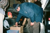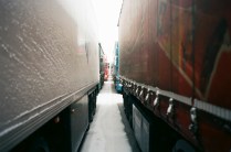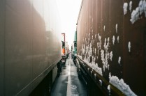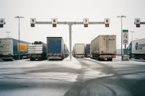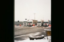 Queste foto sono state scattate in un giorno di pausa forzata, tra un fiocco e l’altro, in mezzo a trattori e rimorchi. L’attesa per chi fa il camionista fa parte del mestiere, ma talvolta non dovrebbe manifestarsi, soprattutto se imprevista e indefinita nella durata. Durante questo fermo ho incontrato cinque autisti rumeni, sorridenti, generosi, necessariamente pazienti. Nonostante tutto. Nonostante la consapevolezza e l’adattamento. Nonostante il pranzo consumato sotto il telone o davanti al motore. Nonostante il ritardo sul viaggio, sulle consegne, sul ritorno a casa. Nonostante le loro parole. “Vedi questa è la vita del camionista, una vita da cani”. Una vita comandata dai numeri non è per tutti. Una vita lontano da casa non è per nessuno.